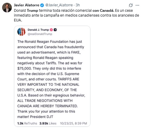 El anuncio se dio luego de que el primer ministro canadiense, Mark Carney, expresara su intención de diversificar las exportaciones hacia otros mercados para reducir la dependencia de Estados Unidos. La controversia surgió a raíz de un anuncio impulsado por el Gobierno de Ontario que utilizó fragmentos de un discurso de Ronald Reagan sobre comercio. La Fundación Ronald Reagan denunció que el material fue editado sin permiso y advirtió que evalúa acciones legales, al considerar que tergiversa las declaraciones originales del expresidente.