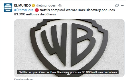 Netflix anunció este viernes la adquisición de Warner Bros. Discovery por 82.700 millones de dólares, una operación histórica que incluye los estudios de cine y televisión, así como HBO y HBO Max.