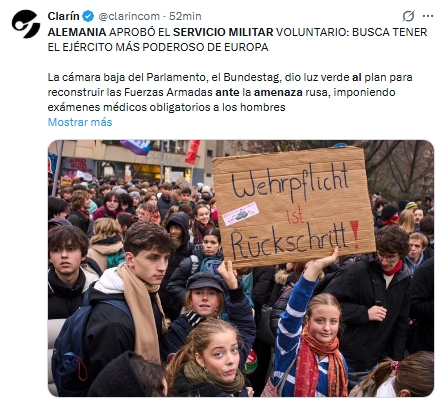 El ministro de Defensa alemán, Boris Pistorius, afirmó que aunque el servicio militar sigue siendo voluntario, si la situación de amenaza permanece o empeora, Alemania podría verse obligada a implementar un servicio militar parcialmente obligatorio para garantizar la defensa del país.