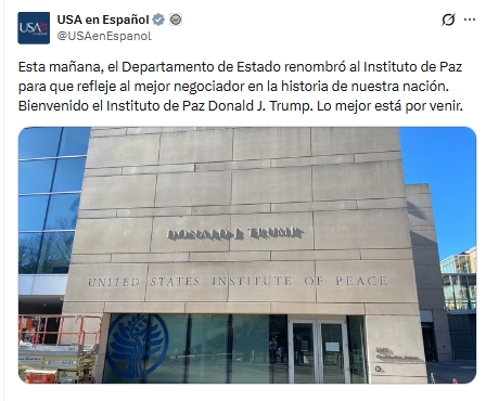 El Departamento de Estado de Estados Unidos anunció el cambio de nombre del Instituto para la Paz, que ahora se llama Instituto para la Paz Donald J. Trump, en reconocimiento según la administración al “mayor negociador” del país.