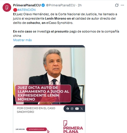 El expresidente de Ecuador, Lenín Moreno (2017-2021), enfrentará un juicio por presunto cohecho dentro del denominado caso Sinohydro, relacionado con la empresa china que construyó la mayor hidroeléctrica del país, obra ejecutada durante su etapa como vicepresidente bajo el gobierno de Rafael Correa.