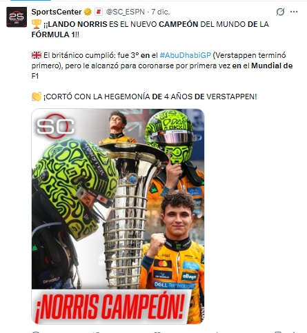 El británico Lando Norris (McLaren) se proclamó campeón del mundo de Fórmula Uno al finalizar tercero en el Gran Premio de Abu Dabi, última carrera de la temporada, disputada en el circuito de Yas Marina. La prueba fue ganada por el neerlandés Max Verstappen (Red Bull), cuatro veces campeón del mundo.