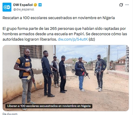 El secuestro ocurrió el 21 de noviembre, cuando 303 alumnos y 12 trabajadores administrativos fueron raptados del internado mixto St. Mary’s. Cerca de 50 lograron escapar en las primeras horas, dejando a 265 cautivos. Por ahora no está claro si la liberación de los 100 estudiantes se logró mediante negociación o por una operación de rescate.