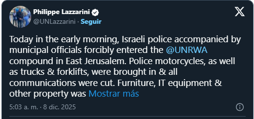 De acuerdo con su declaración publicada en la red social X, las fuerzas israelíes ingresaron al recinto con motocicletas policiales y otros vehículos, además de cortar todas las comunicaciones dentro de las instalaciones. Lazzarini afirmó que durante la acción fueron incautados muebles, equipos informáticos y otros bienes pertenecientes a la organización.