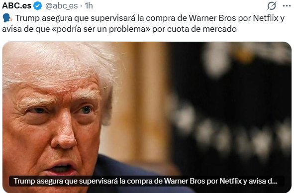 El expresidente estadounidense Donald Trump expresó el domingo sus dudas sobre la posible compra del histórico estudio de Hollywood Warner Bros Discovery por parte de Netflix, señalando que el gigante del streaming “ya tiene una gran porción del mercado” y que la operación “podría ser un problema”.