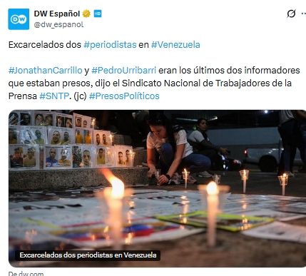 Los dos últimos periodistas que permanecían detenidos en Venezuela fueron excarcelados este jueves, informó el Sindicato Nacional de Trabajadores de la Prensa (SNTP). Jonathan Carrillo, preso desde julio de 2022, salió con medidas cautelares, mientras que Pedro Urribarri, detenido desde mayo de 2025, obtuvo libertad plena, indicó el secretario general del SNTP, Marco Ruiz. Con estas liberaciones ya no hay “ningún periodista ni trabajador de la prensa detenido” en el país, según el sindicato, que contabilizaba 28 casos “detenidos ilegal y arbitrariamente” antes de la amnistía.
