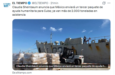 La presidenta de México, Claudia Sheinbaum, confirmó el envío de un tercer barco con ayuda humanitaria hacia Cuba, en medio de la crisis económica que enfrenta la isla.