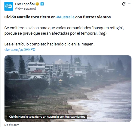 El ciclón Narelle impactó el noreste de Australia, específicamente en el estado de Queensland, con vientos sostenidos de hasta 220 km/h. Las autoridades advirtieron sobre riesgos de fuertes lluvias, marejadas ciclónicas e inundaciones en la región.