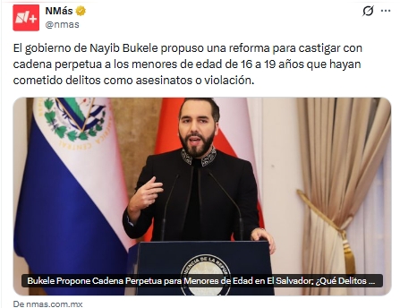 El gobierno de El Salvador, encabezado por Nayib Bukele, propuso aplicar cadena perpetua a menores de edad que cometan delitos como homicidio o violación, independientemente de su vínculo con pandillas. La iniciativa amplía la reciente reforma constitucional que endurece las penas para criminales.