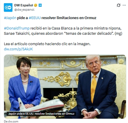Durante el encuentro, Takaichi destacó la importancia de garantizar la seguridad en esa ruta clave para el comercio mundial, aunque explicó que su gobierno enfrenta limitaciones legales para brindar apoyo militar directo, pese a las solicitudes de Washington.