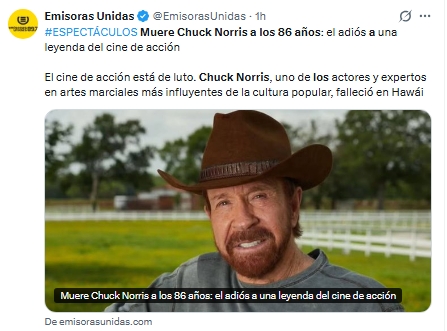 En el comunicado, sus familiares indicaron que el actor murió en paz y rodeado de sus seres queridos. Norris fue una de las figuras más icónicas del cine de acción y las artes marciales, dejando un legado destacado en la industria del entretenimiento.
