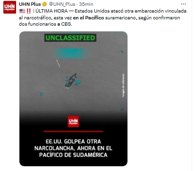 El Ejército de Estados Unidos realizó un nuevo ataque contra una embarcación presuntamente relacionada con el narcotráfico, esta vez en aguas del Pacífico oriental, frente a las costas de Colombia, como parte de sus operaciones ampliadas para frenar el flujo de drogas hacia territorio estadounidense.