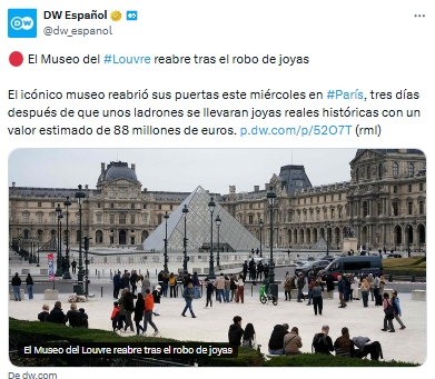Sin embargo, las autoridades del museo precisaron que la reapertura no es total, ya que la Galería de Apolo donde se perpetró el robo permanecerá cerrada por tiempo indefinido mientras continúan las investigaciones.