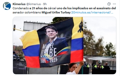 La Fiscalía de Colombia informó este martes que Carlos Eduardo Mora González fue condenado a 21 años de prisión por su participación en el asesinato del aspirante presidencial y senador Miguel Uribe Turbay, ocurrido el 7 de junio en Bogotá.