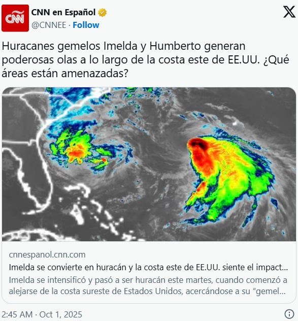 Los huracanes Imelda y Humberto giran en el Atlántico occidental y causan olas peligrosas, corrientes de resaca, inundaciones costeras y erosión de las playas a lo largo de la costa este de Estados Unidos.