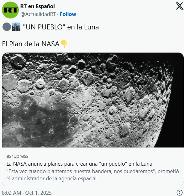 Durante el Congreso Aeronáutico Internacional celebrado en Sídney, Australia, el administrador de la NASA, Sean Duffy reveló que la agencia espacial estadounidense no solo planea establecer un simple puesto de avanzada en la superficie lunar, sino todo "un pueblo" para la década entrante.