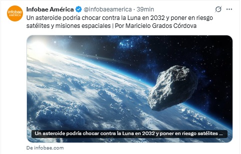 Un grupo de investigadores de la NASA y de centros internacionales advirtió sobre el riesgo de que el asteroide 2024 YR4 impacte en la superficie de la Luna en diciembre de 2032. Aunque la probabilidad de colisión se estima en apenas un 4%, el escenario preocupa por la posibilidad de que se genere una nube de fragmentos capaz de afectar la órbita baja de la Tierra, donde operan satélites, estaciones espaciales y misiones en curso. El tema ha despertado atención debido al impacto que podría tener en la seguridad de futuras operaciones espaciales.