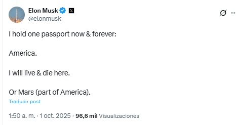 La idea no es nueva. En marzo pasado, Musk ya había señalado que no planea abandonar EE. UU., y que si algún día viviera en Marte, lo haría bajo la bandera estadounidense. Estas declaraciones se enmarcan en su visión de crear una civilización autosostenible fuera de la Tierra, un plan que proyecta desarrollar en las próximas décadas.