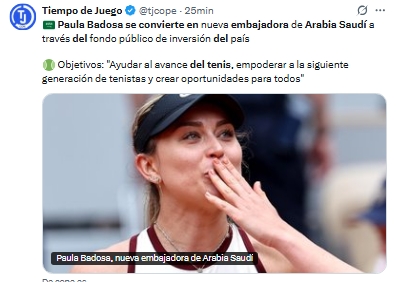 La tenista española Paula Badosa anunció su fichaje como embajadora de Arabia Saudí, con el objetivo de promover el tenis, empoderar a la próxima generación de jugadores y generar nuevas oportunidades en el deporte.