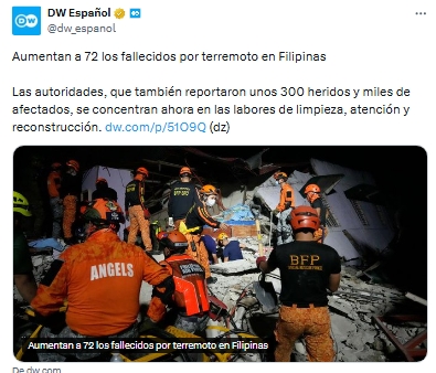 El Gobierno de Filipinas elevó este jueves a 72 el número de fallecidos por el fuerte terremoto que sacudió el país la noche del martes, mientras que los heridos ascienden a casi 300 y unas 171.000 personas resultaron afectadas.
