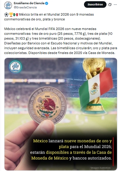 El Banco de México emitirá nueve monedas conmemorativas del Mundial 2026 en oro, plata y bimetálicas (denominaciones de 10, 20 y 25 pesos).