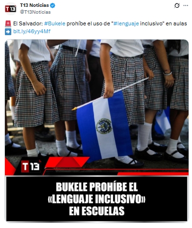 El presidente de El Salvador, Nayib Bukele, anunció la prohibición del uso del "lenguaje inclusivo" en todas las escuelas públicas del país. La medida, respaldada por la ministra de Educación, Karla Trigueros, busca “garantizar el buen uso del idioma” y “proteger a la niñez y adolescencia de injerencias ideológicas que afecten su desarrollo integral”.