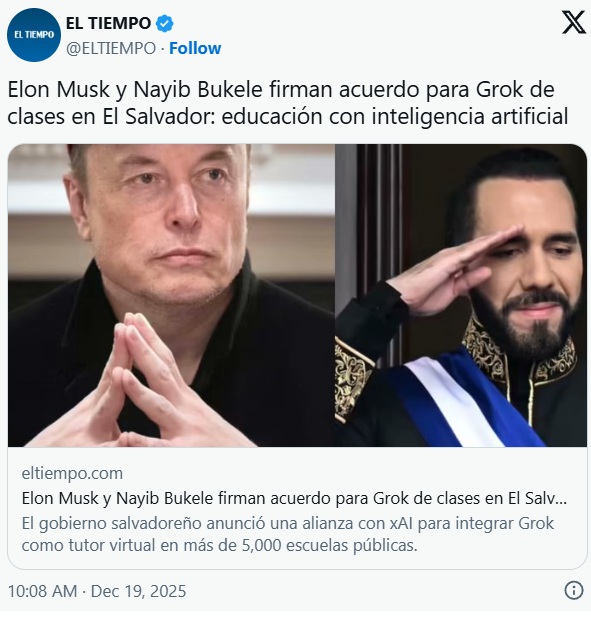 La inteligencia artificial desarrollada por la empresa xAI, propiedad de Elon Musk, será incorporada al sistema educativo público de El Salvador como parte de un acuerdo anunciado por el presidente Nayib Bukele.