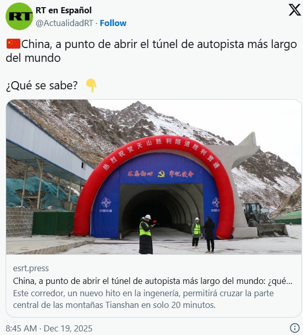 China se prepara para inaugurar otro hito en la ingeniería con la apertura del túnel Tianshan Shengli ('La victoria Tianshan'), la autopista subterránea más larga del mundo, informan los medios locales.