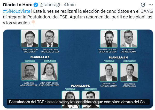 En la contienda participan cinco planillas. La Planilla 1, integrada por Avanza, Plataforma de Profesionales por la Justicia y Unión por la Justicia, postula a César Fernando Díaz García como titular y a Ángel Antonio Rodríguez de León como suplente. La Planilla 2, Alianza Unida por el Gremio (AUG), propone a Alfonso Cifuentes de León y a Erick Samuel Morales Román, aunque aún no ha sido notificada oficialmente. La Planilla 3, Unión, Libertad y Justicia, presenta a Julio José Aguilar Martínez y a Linda Greta de Los Ángeles Rivera Pérez. La Planilla 4, Unidos por la Democracia, impulsa a Gregorio José Saavedra Zepeda y a Edgar Ortiz Romero. Finalmente, la Planilla 5, sin nombre oficial, está conformada por María Alicia Ovalle Gramajo y José Pablo Pacheco.