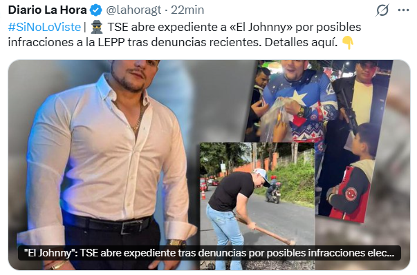 Johnny Josué Ayala Montenegro, conocido como “El Johnny”, excandidato a diputado, figura entre las personas a quienes la Inspección General del Tribunal Supremo Electoral (TSE) les ha iniciado un expediente, tras denuncias por posibles infracciones a la Ley Electoral y de Partidos Políticos (LEPP).