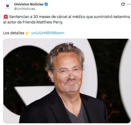 Médico es sentenciado por suministrar ketamina ilegal a Matthew Perry