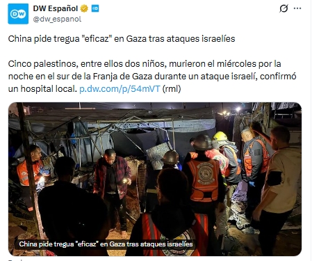 El Gobierno chino instó a que se “implemente eficazmente” el alto el fuego en Gaza, luego de que un ataque israelí la noche anterior dejara cinco muertos incluidos dos niños de 8 y 10 años y dos mujeres en un campamento de desplazados en Jan Yunis, al sur del enclave.