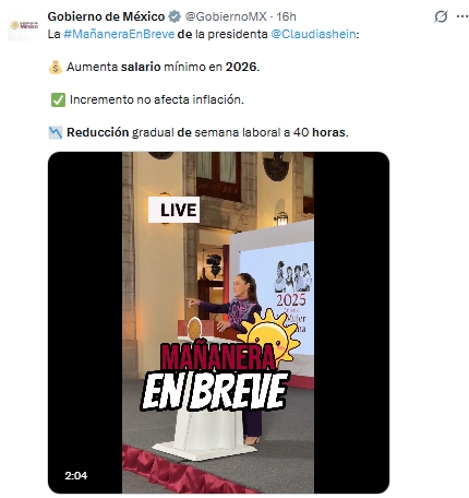 México alcanzó un consenso histórico entre el sector empresarial y el trabajador para implementar un incremento del 13% al salario mínimo general y profesional a partir de 2026, acompañado de una reducción gradual de las horas laborales, según anunció la presidenta Claudia Sheinbaum.