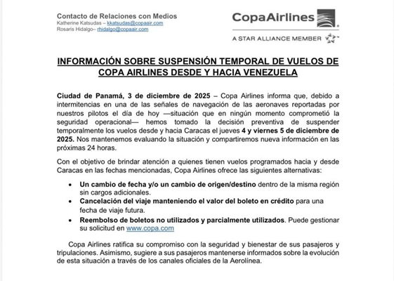 Las aerolíneas panameñas Copa Airlines y Wingo suspendieron por dos días sus vuelos hacia y desde Venezuela, luego de que autoridades estadounidenses emitieran una alerta por un aumento de actividad militar en el Caribe, situación que se sumó a intermitencias en señales de navegación reportadas por pilotos.