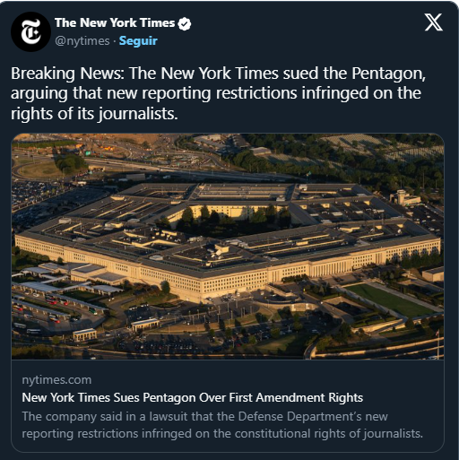 El New York Times presentó una demanda en un tribunal federal de Washington contra el Pentágono, alegando que su nuevo conjunto de reglas para periodistas viola la Primera Enmienda al imponer límites que afectan la libertad de prensa, expresión y el debido proceso.