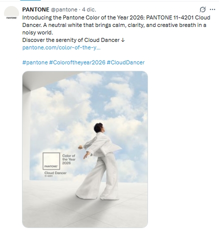 El Pantone Color Institute anunció que el color del año 2026 será “Cloud Dancer”, un tono de blanco suave y equilibrado que, según la institución, busca capturar el espíritu cultural del próximo año.