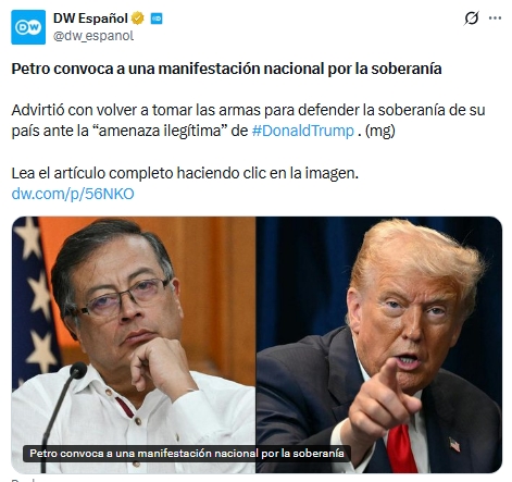 El presidente de Colombia, Gustavo Petro, convocó a una manifestación nacional por la soberanía, programada para el próximo miércoles a las 4:00 de la tarde, en medio de las crecientes tensiones con Estados Unidos tras la detención del mandatario venezolano Nicolás Maduro en Caracas.