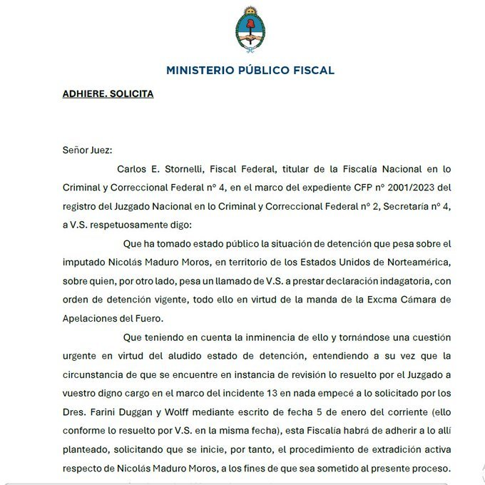 El fiscal argentino Carlos Stornelli solicitó a la Justicia federal que inicie el pedido de extradición de Nicolás Maduro a Estados Unidos, en el marco de una causa abierta en Argentina por presuntos crímenes de lesa humanidad cometidos en Venezuela. En un escrito dirigido al juez Sebastián Ramos, Stornelli señaló que existe una orden de detención vigente y un llamado a declaración indagatoria contra el mandatario venezolano, por lo que consideró “urgente” avanzar con el procedimiento de extradición activa.