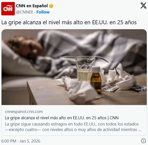 La gripe sigue causando estragos en todo EE.UU., con todos los estados —excepto cuatro— con niveles altos o muy altos de actividad mientras una nueva cepa viral llamada subclado K continúa propagándose.