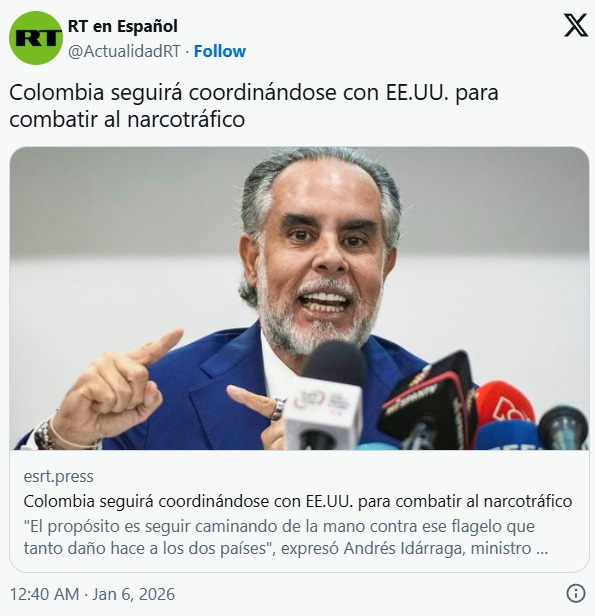 "El Gobierno de Colombia, a través del Ministerio del Interior y del Ministerio de Justicia, le hacen saber al Gobierno de EE.UU., a través de una agencia de inteligencia de ellos, que vamos a seguir coordinando y cooperando en la lucha contra el narcotráfico", dijo el funcionario, en un video publicado en su cuenta en X.