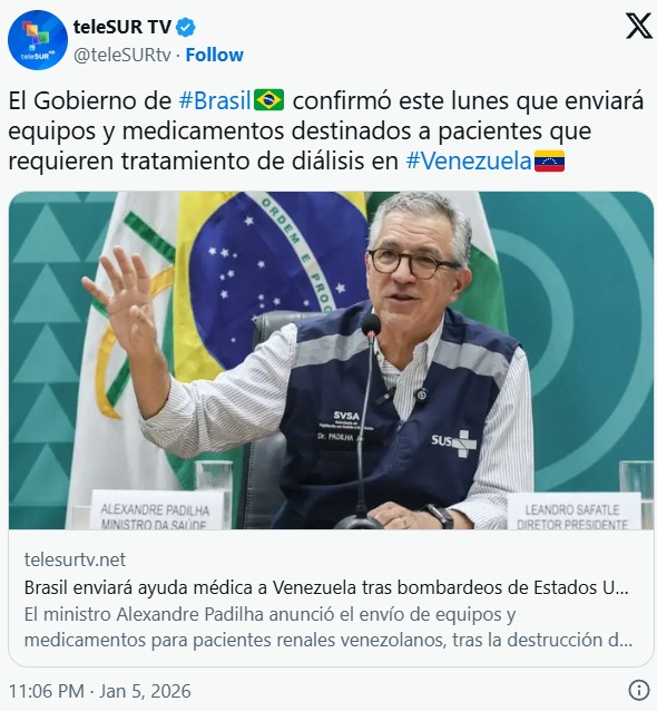 El ministro de Salud de Brasil, Alexandre Padilha, confirmó este lunes que enviarán equipos y medicamentos para pacientes que necesitan diálisis en Venezuela, luego de que EE.UU. destruyera un centro de distribución de insumos y tratamiento para pacientes renales en su reciente ataque sobre el país.