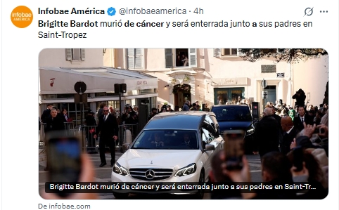 D'Ormale no especificó el tipo de cáncer que padecía Bardot, aunque señaló que “resistió muy bien las dos operaciones a las que se sometió para tratar la enfermedad que le quitó la vida”. Durante el otoño, la icónica figura del cine francés fue hospitalizada en dos ocasiones, sin que entonces se dieran a conocer las razones médicas.