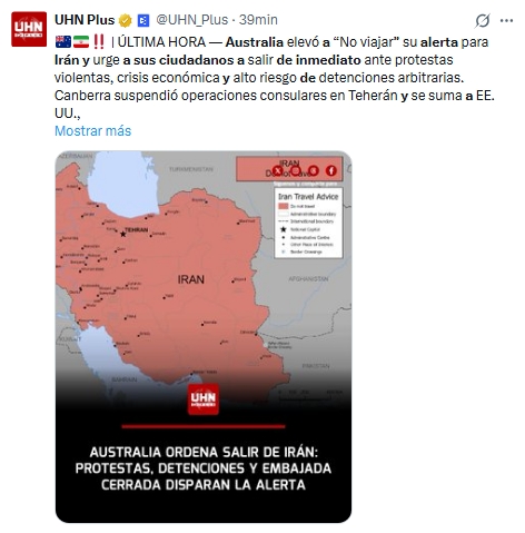 El Gobierno de Australia emitió una advertencia de viaje urgente para sus ciudadanos en Irán, al advertir que el país atraviesa una situación de seguridad “extremadamente peligrosa”. En un comunicado oficial, las autoridades australianas instaron de forma tajante a no viajar al país y pidieron a quienes ya se encuentran allí que lo abandonen “lo antes posible”, ante la presencia de protestas violentas en todo el territorio que podrían intensificarse sin previo aviso.