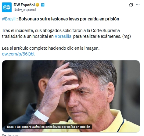 El expresidente de Brasil Jair Bolsonaro sufrió “lesiones leves” tras una caída en su celda, informó la Policía Federal. Según el comunicado oficial, el exmandatario recibió atención médica luego de reportar que había caído durante la madrugada.