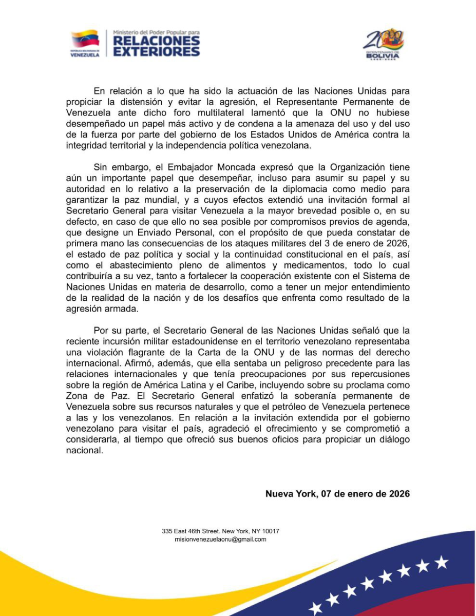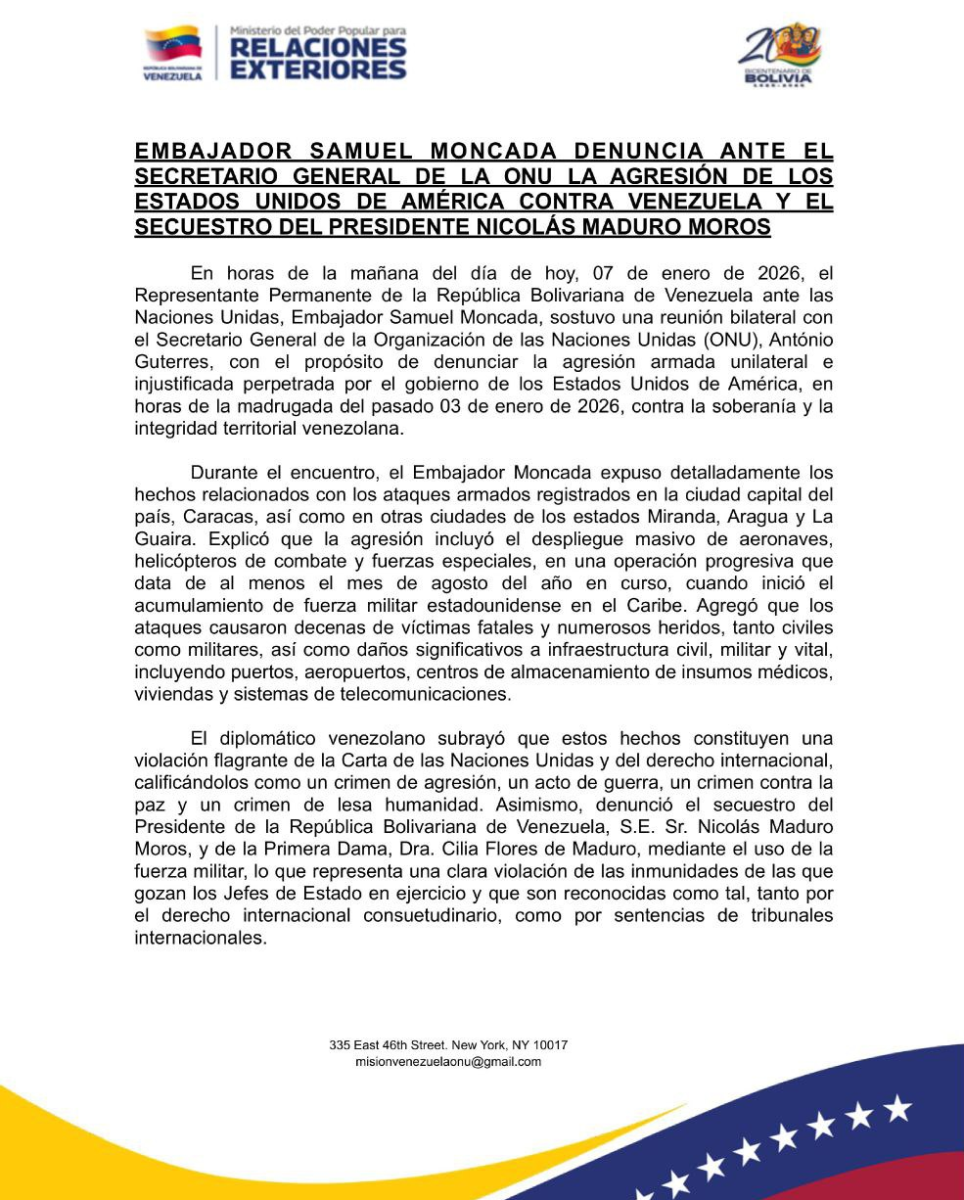 Venezuela denunció ante la ONU una “agresión armada” de Estados Unidos ocurrida el 3 de enero, que habría incluido ataques en varias regiones del país y el secuestro del presidente Nicolás Maduro y la primera dama, Cilia Flores.