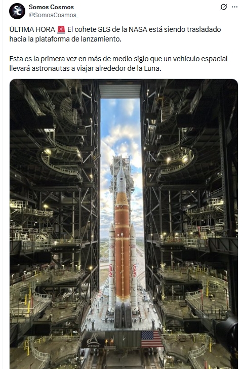 La NASA trasladó el cohete Space Launch System (SLS) y la nave Orion a la Plataforma de Lanzamiento 39B del Centro Espacial Kennedy, en Florida, como parte de los preparativos finales para la misión Artemis 2, el primer vuelo tripulado alrededor de la Luna en más de 50 años.