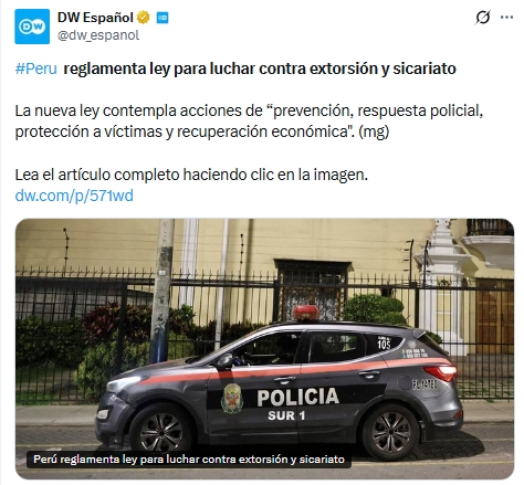 El Gobierno de Transición de Perú, encabezado por José Jerí, aprobó el reglamento de la nueva ley contra los delitos de extorsión y sicariato, con el que busca pasar “de la defensiva a la ofensiva” frente a la delincuencia y el crimen organizado en el país.