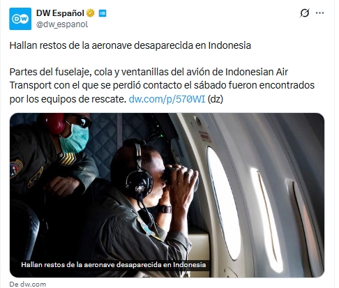 Las autoridades de Indonesia informaron el hallazgo de varias piezas del avión turbohélice de Indonesian Air Transport que perdió contacto el sábado con la torre de control en la región centro-este del país. A bordo de la aeronave viajaban 10 personas, pero hasta el momento no se ha localizado a los pasajeros.
