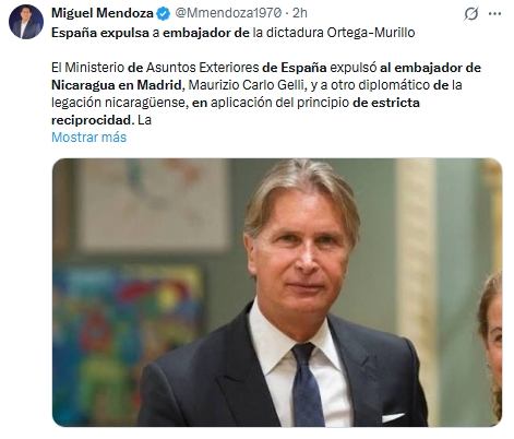 El Ministerio de Asuntos Exteriores de España ordenó la expulsión del embajador de Nicaragua en Madrid, Mauricio Carlo Gelli, en respuesta a la reciente expulsión del embajador español y del segundo jefe de misión en Managua. La Cancillería española calificó la medida como un acto de “estricta reciprocidad” y señaló que el personal diplomático expulsado suele abandonar el país en un plazo de 48 horas tras la notificación.