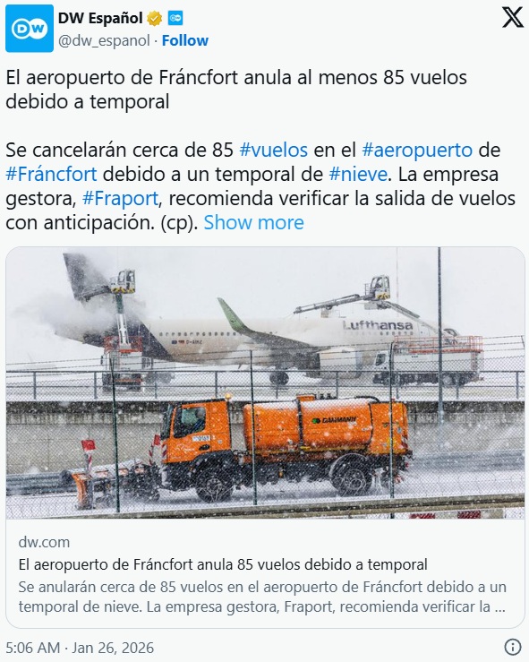 El aeropuerto alemán de Fráncfort va a anular 85 de los 1.040 vuelos que estaban previstos para este lunes debido a un temporal de nieve, dijo una portavoz de Fraport, la empresa que gestiona el aeródromo.